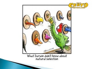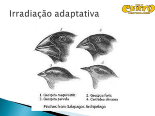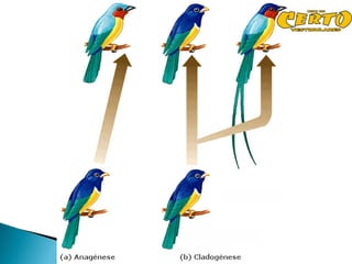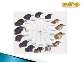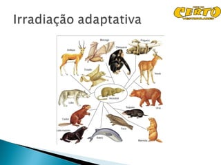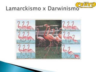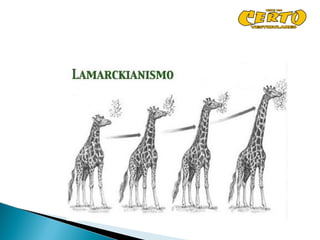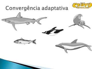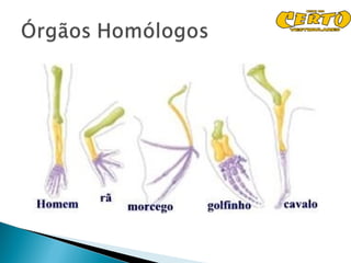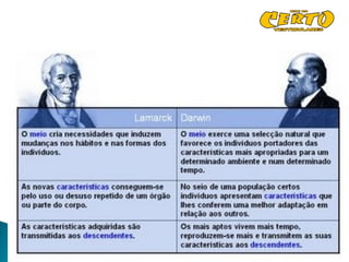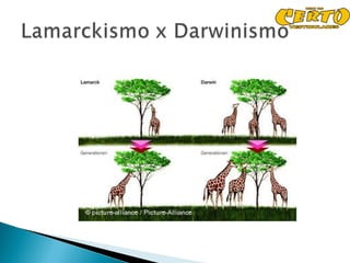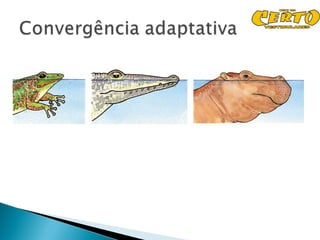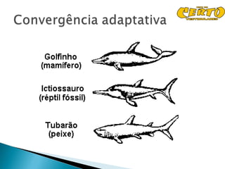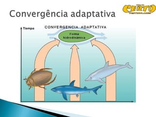 O documento discute os principais conceitos da teoria da evolução, incluindo evidências como fósseis e anatomia comparada, e as contribuições de Lamarck, Darwin e Dobzhansky. Apresenta os conceitos de evolução divergente e convergente.