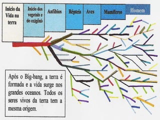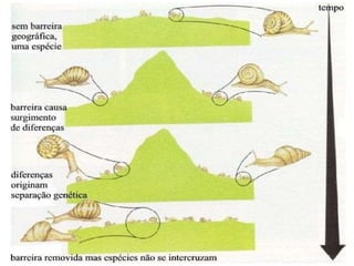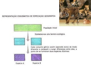 3) A especiação ocorre em 5 estágios, começando com a divisão de uma população devido a mudanças ambientais e culminando no isolamento reprodutivo de subpopulações em diferentes espé
