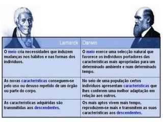 O documento discute os principais conceitos da evolução das espécies, incluindo as teorias do criacionismo, evolução e especiação. Apresenta evidências da evolução como fósseis, embriologia e órgãos vestigiais. Também explica as teorias de Lamarck, Darwin e a Síntese Evolutiva Moderna, que integrou a genética de Mendel.
