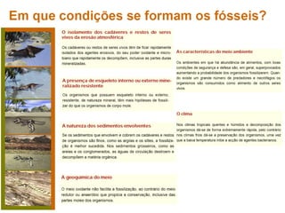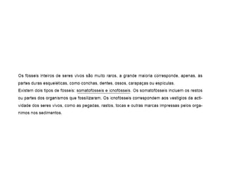 Este documento resume as principais evidências da evolução biológica, incluindo fósseis, adaptação ao meio ambiente, e semelhanças anatômicas. Discute a importância dos fósseis para datar rochas e ambientes antigos, além dos processos de fossilização e métodos de datação de fósseis.