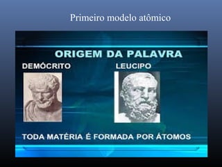 O documento descreve a evolução dos modelos atômicos ao longo da história, começando com o primeiro modelo filosófico de Demócrito e Leucipo no século V a.C., passando pelas contribuições de Dalton, Thomson, Rutherford e Bohr até o desenvolvimento do modelo atômico moderno com a introdução dos números quânticos e conceitos como órbitas eletrônicas e níveis de energia.
