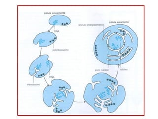 O documento resume a origem e evolução da célula, desde as primeiras células procariontes que surgiram há 3,5 bilhões de anos até as células eucariontes complexas de hoje. Detalha as características básicas das células procariontes e eucariontes, incluindo suas organelas e estruturas como mitocôndrias, núcleo e membranas. Explica também a evolução dos seres unicelulares para os pluricelulares.