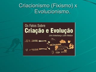 O documento discute a evolução versus o criacionismo, apresentando evidências para a evolução das espécies ao longo do tempo, incluindo embriologia, anatomia comparada, registros fósseis, bioquímica e órgãos vestigiais. Também resume as teorias evolucionárias de Lamarck e Darwin, e como a síntese moderna incorporou a genética para explicar como as mudanças ocorrem. Finalmente, discute especiação e deriva genética.