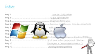 Este documento resume a evolução dos sistemas operativos de código aberto. Discute os tipos de código fonte aberto e fechado, o significado do GNU e a origem do termo Linux. Também compara o Multics e DOS e lista vantagens e desvantagens de distribuições Linux, Windows e Mac OS. Uma cronologia de lançamentos de sistemas operativos é fornecida.