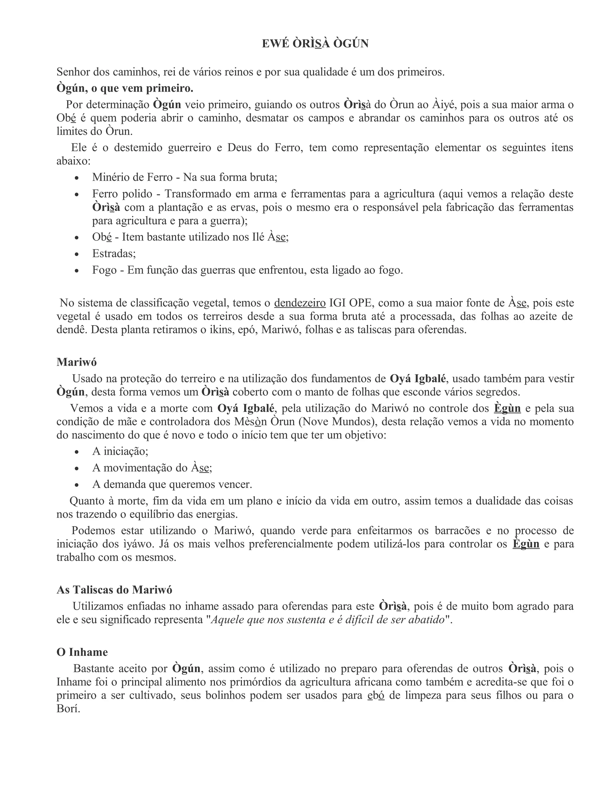 O documento explora a figura do òrìsà Ògún, deus do ferro e guerreiro, destacando sua importância na agricultura e em rituais afro-brasileiros. Menciona diversos elementos simbólicos associados a Ògún, como o dendezeiro e o inhame, além da dualidade entre vida e morte no contexto de oferendas e iniciações. Também são relatadas as propriedades medicinais de várias plantas e suas utilizações em rituais de limpeza e proteção.