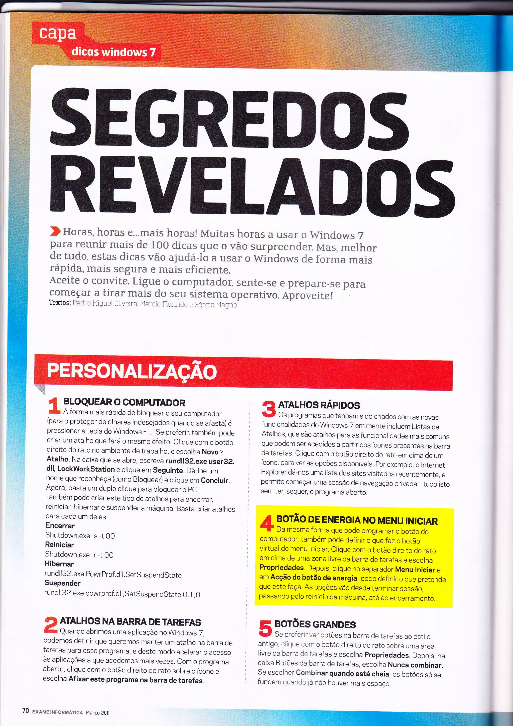 1) O documento fornece dicas para melhorar a produtividade e segurança no Windows, incluindo como bloquear o computador, criar atalhos e controlar o som.