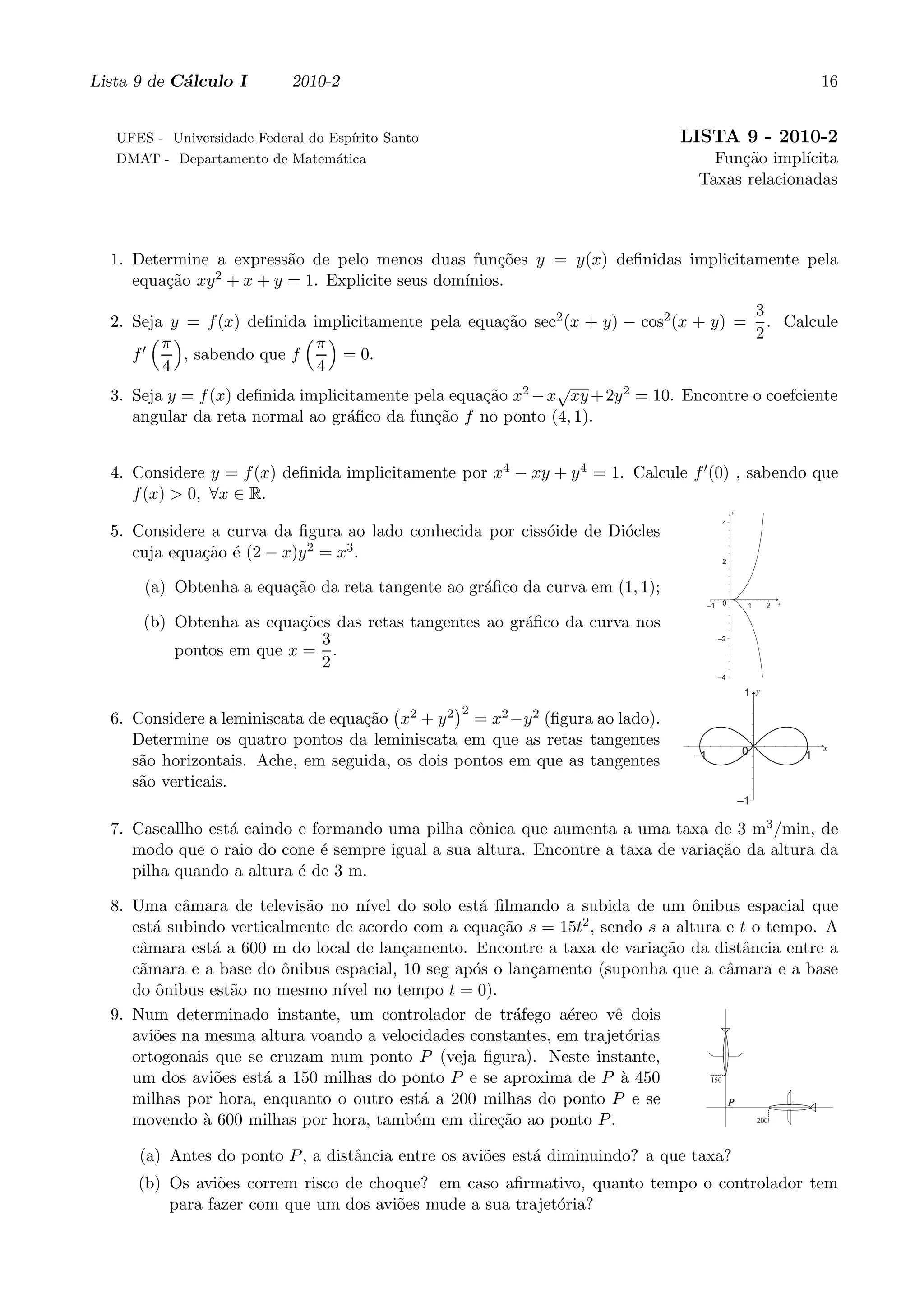 1) A lista apresenta 14 problemas sobre funções implícitas e suas derivadas. Inclui questões sobre curvas como elipse, cissóide de Diócles e leminiscata.
