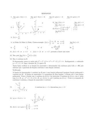 O documento apresenta exercícios sobre limites laterais, limites de funções e continuidade. No primeiro exercício, é pedido para calcular limites laterais de funções no ponto x=1. No segundo, esboçar gráficos de funções e calcular limites no ponto x=1. No terceiro, dar um exemplo onde o limite do módulo de f existe, mas o limite de f não existe quando x vai a 0.