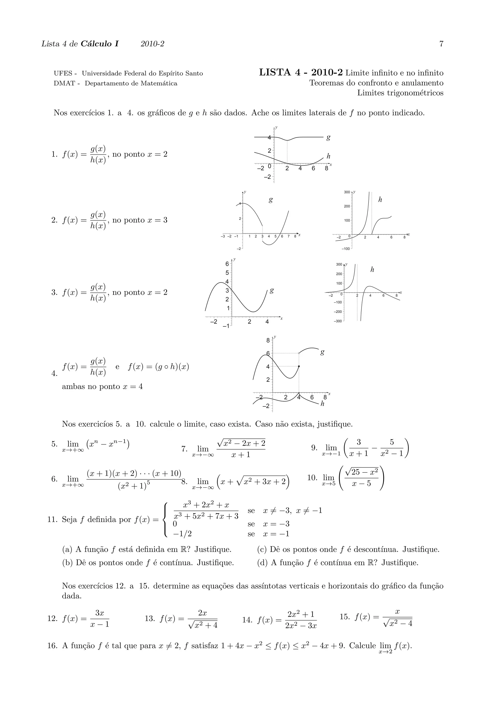 1. O documento apresenta uma lista de exercícios sobre limites infinitos e no infinito, teoremas do confronto e anulamento, e limites trigonométricos. Inclui 33 exercícios para calcular limites ou verificar a continuidade de funções.