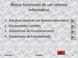 O documento descreve os principais blocos funcionais de um sistema informático, incluindo a estrutura geral com unidades de processamento central, dispositivos de entrada e saída e armazenamento, além de detalhar os componentes centrais e exemplificar dispositivos de armazenamento e entrada/saída.