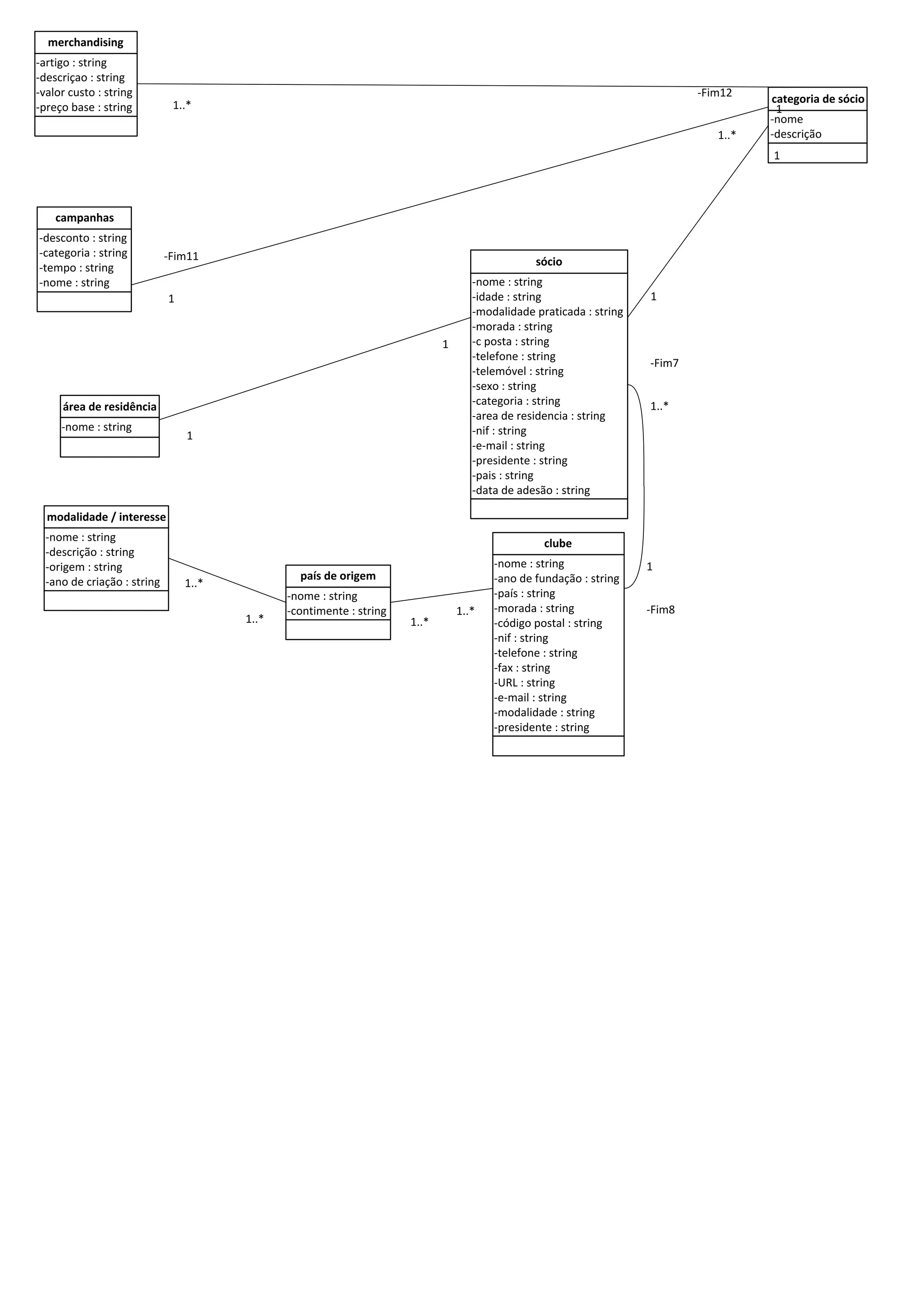 O documento descreve uma estrutura de dados para um sistema de gestão de um clube desportivo. Contém informações sobre sócios, modalidades, campanhas de marketing, áreas de residência e países. Lida com dados como nomes, descrições, preços, datas de adesão e outros detalhes relevantes para a gestão do clube.