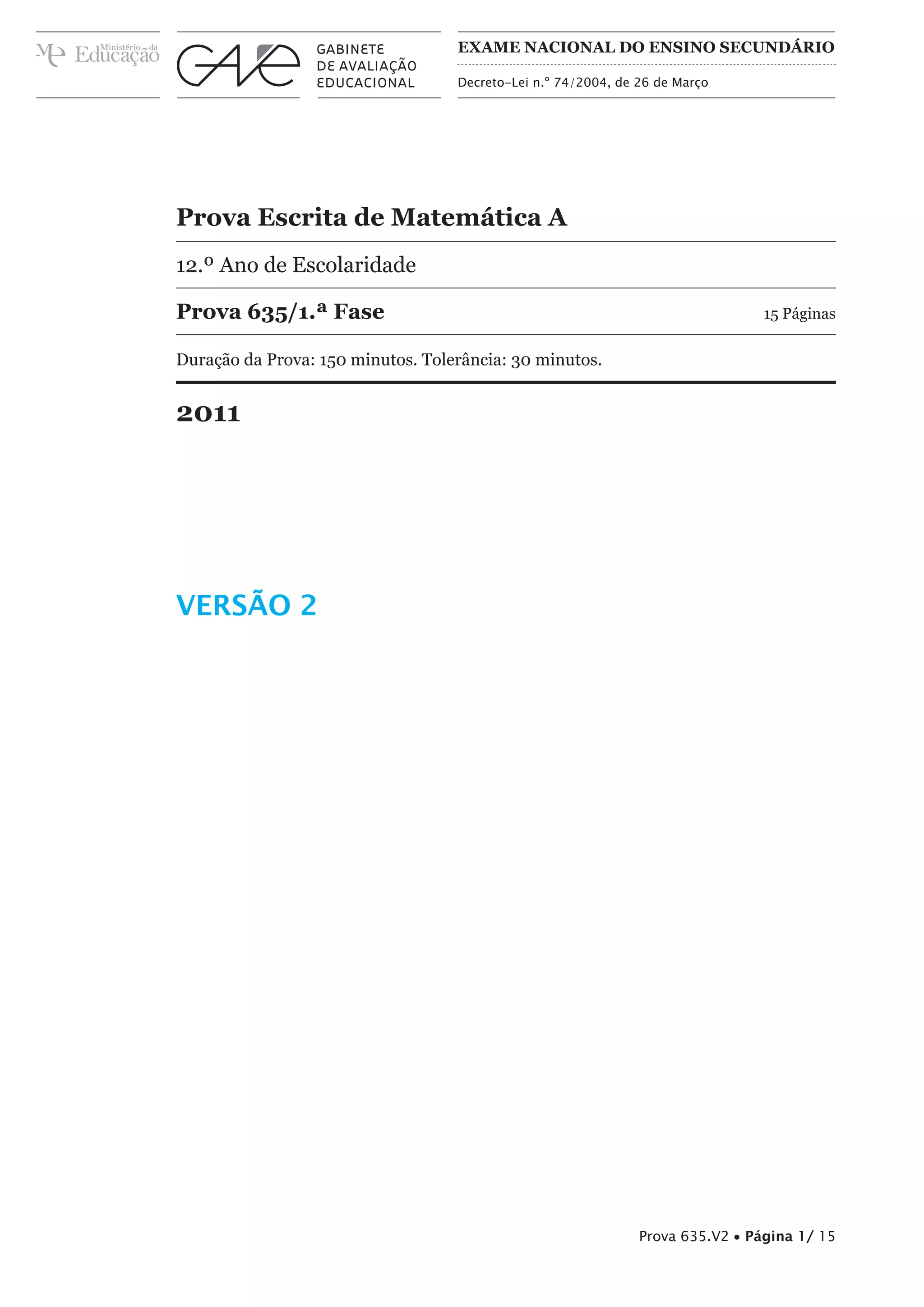 Este documento apresenta o enunciado de uma prova de Matemática A do 12o ano do Ensino Secundário português. A prova inclui 15 páginas e tem a duração de 150 minutos, dividida em dois grupos. O Grupo I contém itens de escolha múltipla e o Grupo II contém itens que requerem cálculos e justificações. A prova fornece vários conceitos, fórmulas e propriedades matemáticas úteis para responder aos itens.