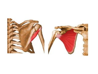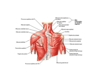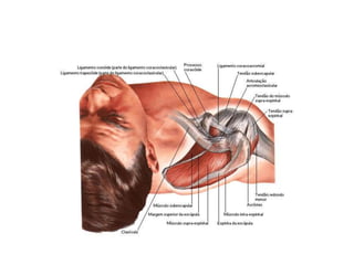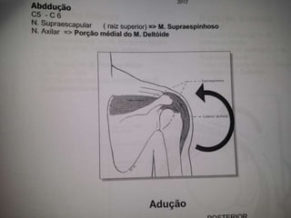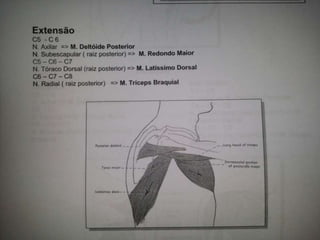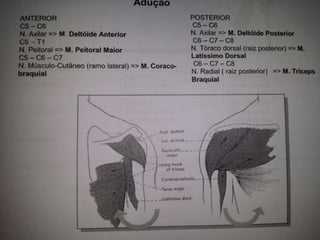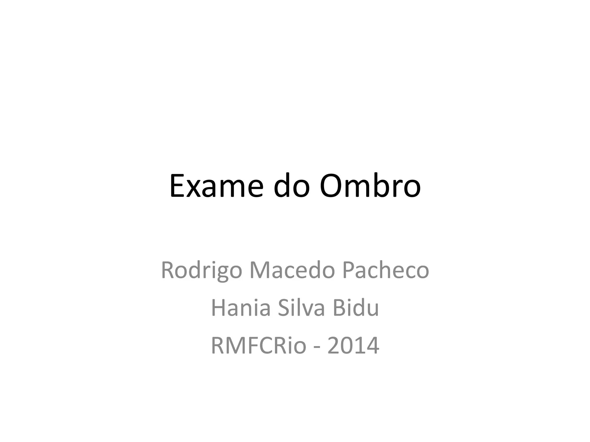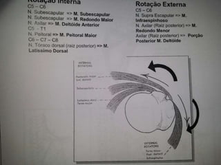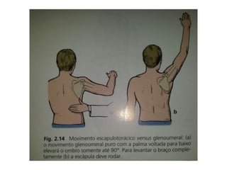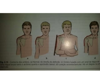 O documento discute o exame físico do ombro, enfatizando a importância da avaliação clínica através da anamnese, observação, palpação e testes de movimento. Também aborda as principais causas de dor no ombro como síndrome do impacto, instabilidade, tendinites e lesões do manguito rotador, além de exercícios e manobras para avaliar essas condições.