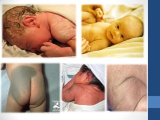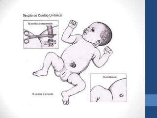 O documento define termos relacionados ao nascimento e classifica recém-nascidos de acordo com idade gestacional, peso e sinais vitais. Também descreve cuidados ao recém-nascido, escala de Apgar, exame físico e responsabilidades do enfermeiro.