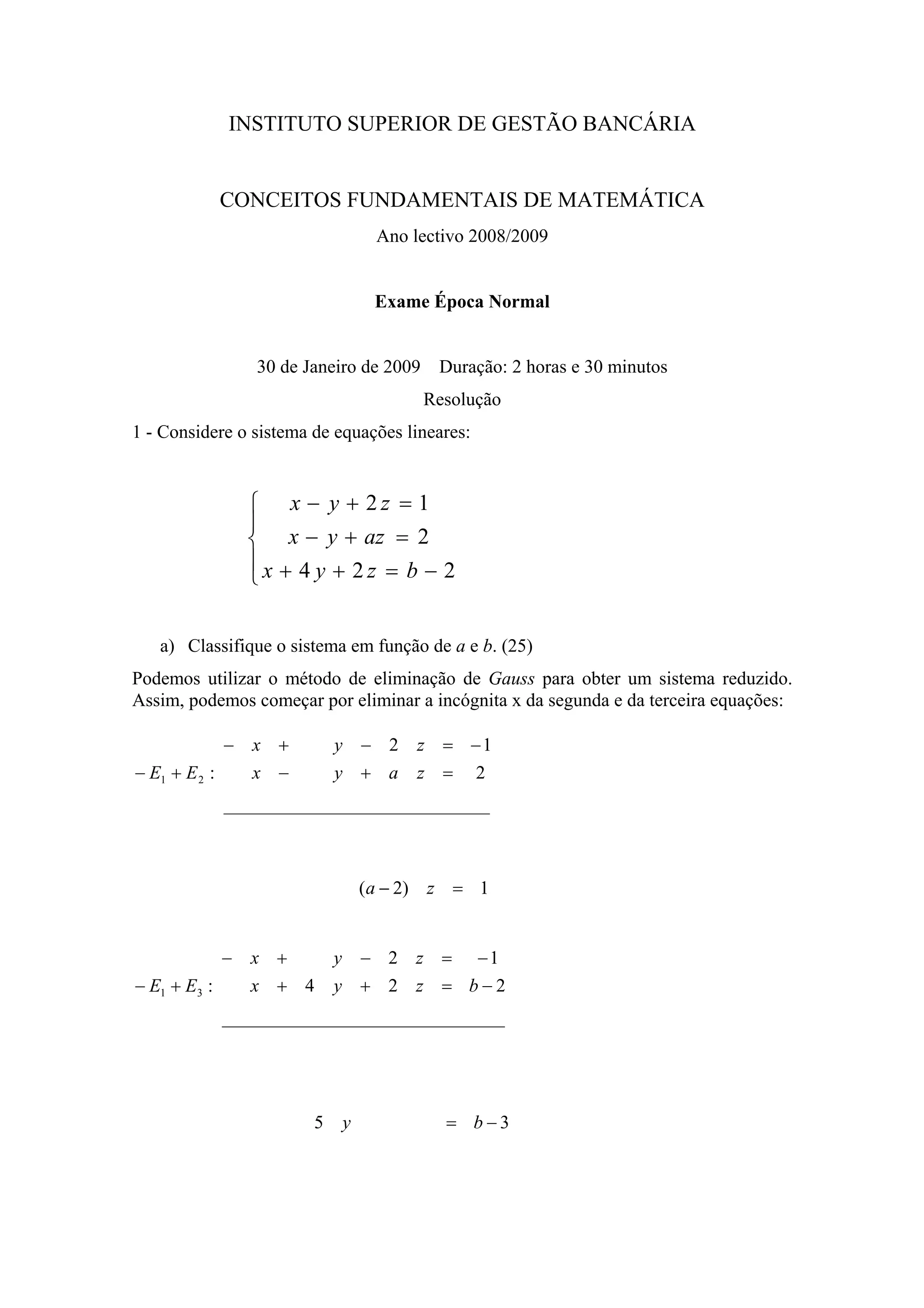 Este documento apresenta questões sobre conceitos fundamentais de matemática para um exame. A primeira questão pede para classificar um sistema de equações lineares e resolvê-lo para valores específicos. A segunda questão analisa propriedades de uma função, incluindo seu domínio, zeros, derivada e representação gráfica. A terceira questão pede para determinar primitivas de funções e calcular áreas. A quarta questão estuda a convergência de séries e calcula suas somas. A quinta questão trata de combinatórias envolvendo distribuição de técn