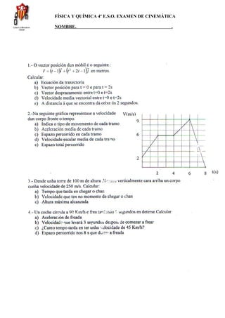 O documento é um exame de cinemática para alunos do 4o ano do ensino secundário. Ele contém questões sobre conceitos básicos de cinemática como velocidade, aceleração e movimento retilíneo uniforme.