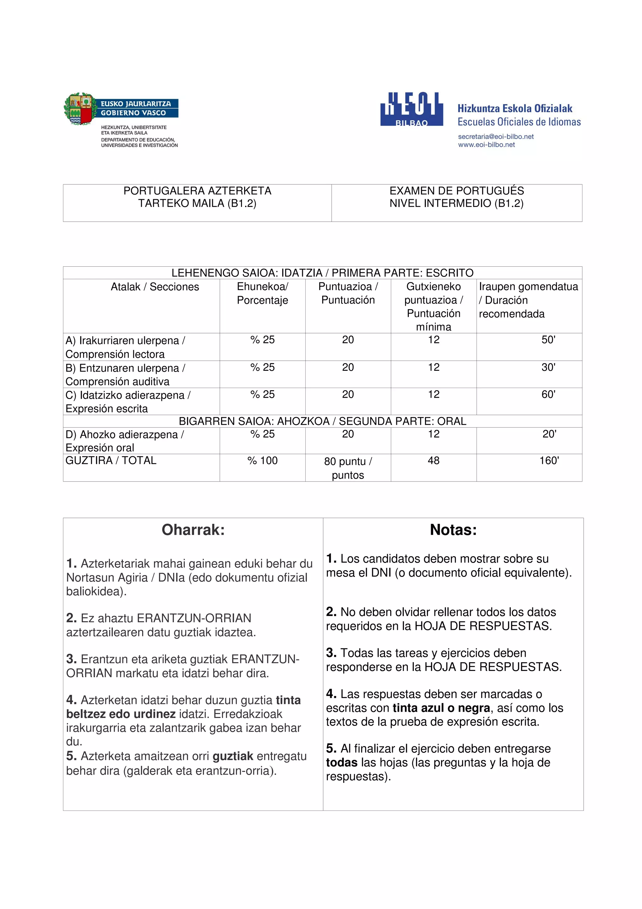 Este documento fornece instruções sobre um exame de língua portuguesa para nível intermediário (B1.2). O exame é dividido em duas partes: escrita e oral. A parte escrita inclui questões de compreensão leitora e auditiva e uma tarefa de expressão escrita. A parte oral avalia a expressão oral do candidato. O documento fornece detalhes sobre a duração, pontuação e instruções para cada seção, bem como notas gerais sobre o exame.