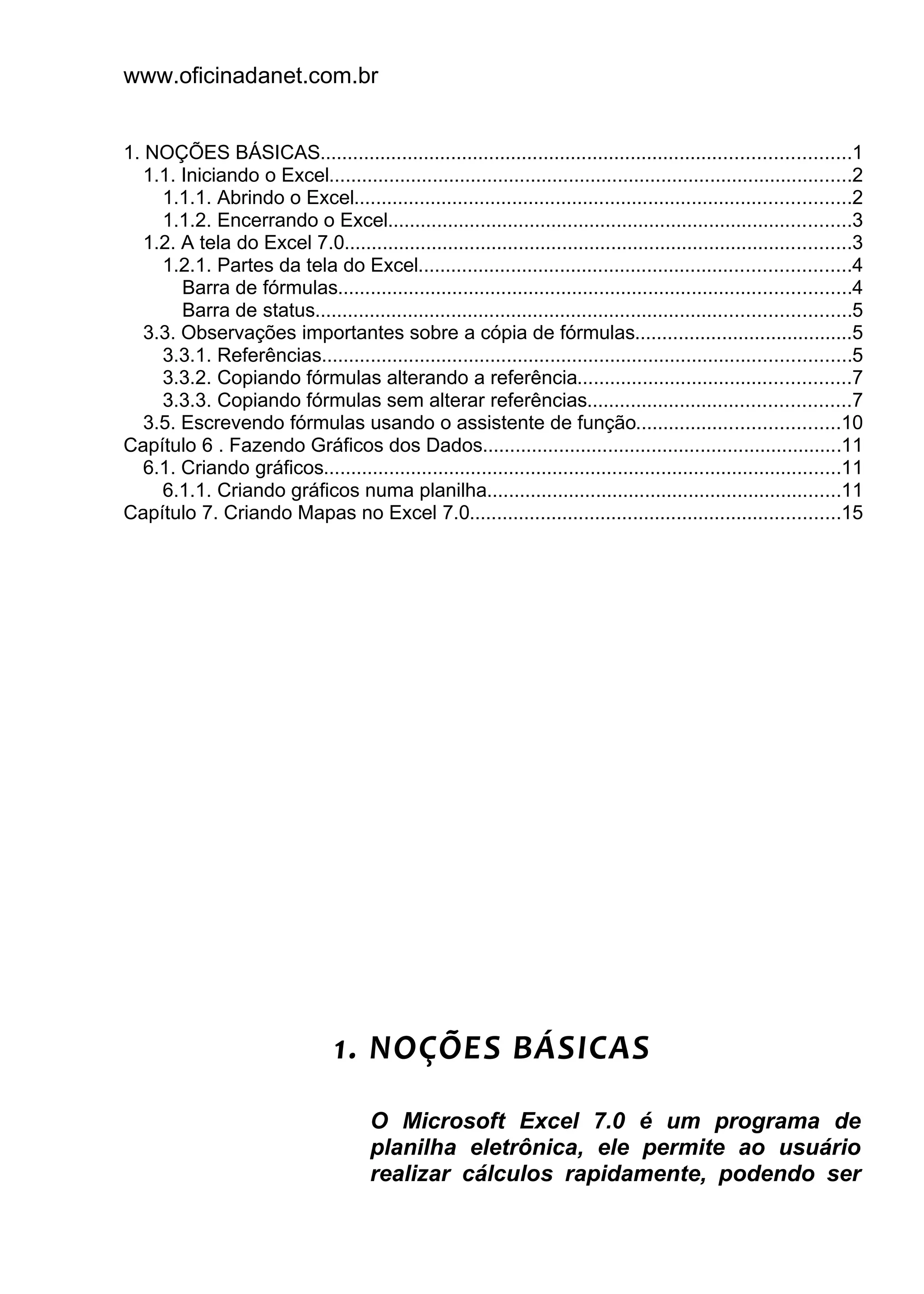 1) O documento descreve as noções básicas do Microsoft Excel 7.0, incluindo como iniciar e fechar o programa, as partes da tela e como criar fórmulas e gráficos.