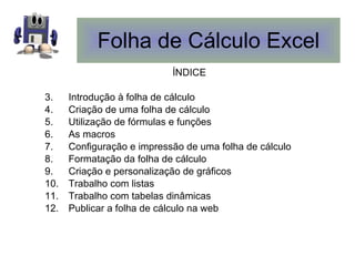 Folha de CálculoExcel ÍNDICE Introdução à folha de cálculo Criação de uma folha de cálculo Utilização de fórmulas e funções As macros Configuração e impressão de uma folha de cálculo Formatação da folha de cálculo Criação e personalização de gráficos Trabalho com listas Trabalho com tabelas dinâmicas Publicar a folha de cálculo na web