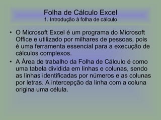 Folha de CálculoExcel 1. Introdução à folha de cálculo O Microsoft Excel é um programa do Microsoft Office e utilizado por milhares de pessoas, pois é uma ferramenta essencial para a execução de cálculos complexos. A Área de trabalho da Folha de Cálculo é como uma tabela dividida em linhas e colunas, sendo as linhas identificadas por números e as colunas por letras. A intercepção da linha com a coluna origina uma célula.
