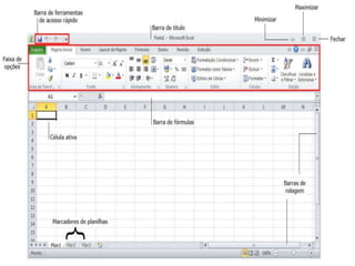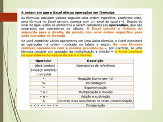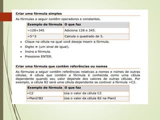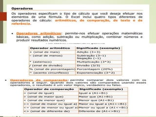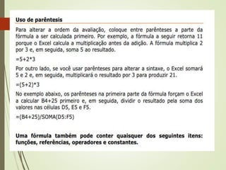 Este documento lista funções matemáticas e lógicas em português, incluindo funções como Maior, Mínimo, Média, Soma, Se, E, Ou. Ele fornece a sintaxe de cada função com exemplos de como inserir números ou expressões lógicas como parâmetros.