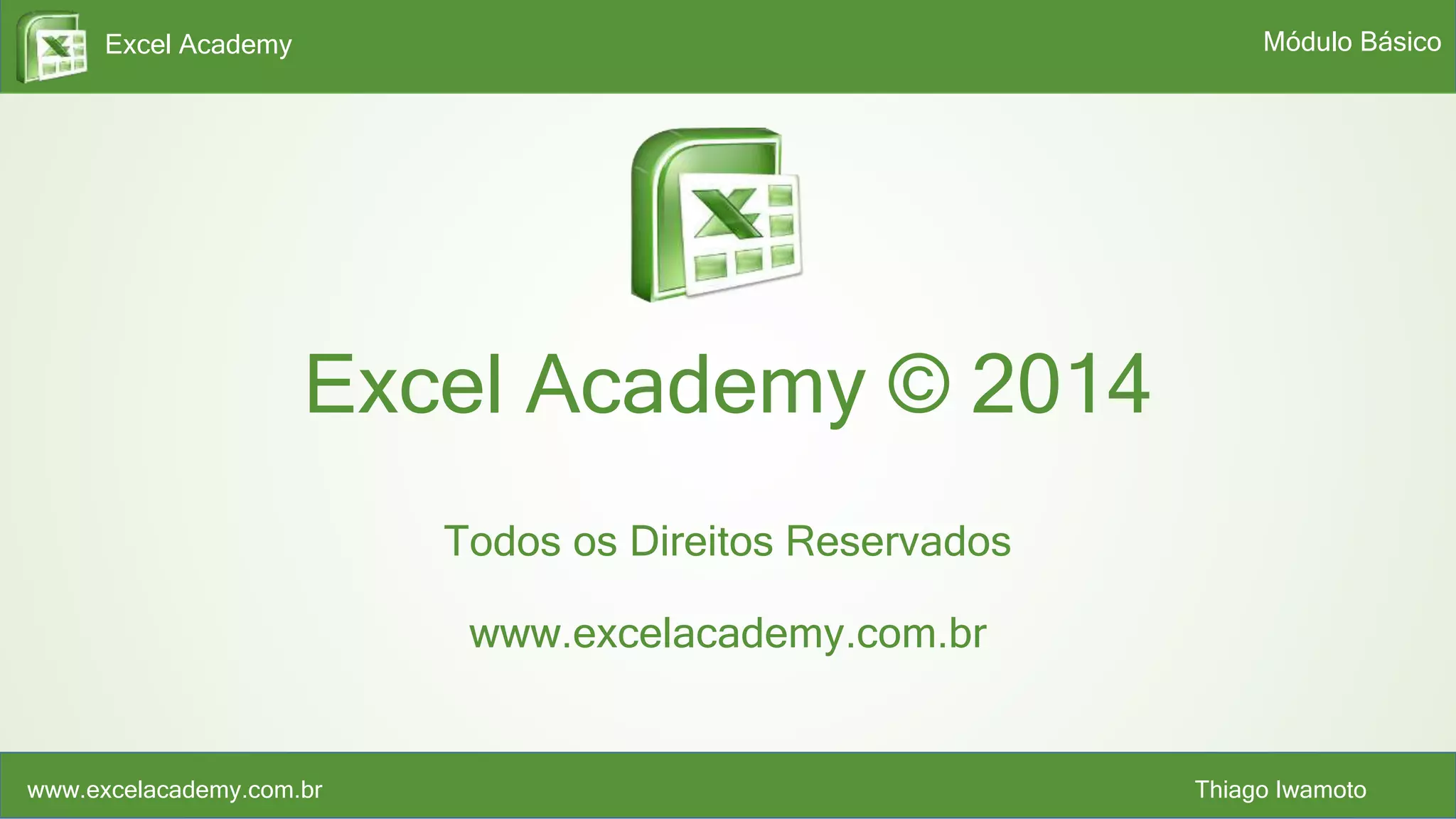 O documento descreve o conteúdo de um curso sobre Excel da Excel Academy, com 11 capítulos e várias aulas em cada capítulo, cobrindo tópicos como introdução ao Excel, gerenciamento de planilhas, comandos básicos, matemática básica, formatação, impressão, fórmulas e funções, proteção, templates e imagens.