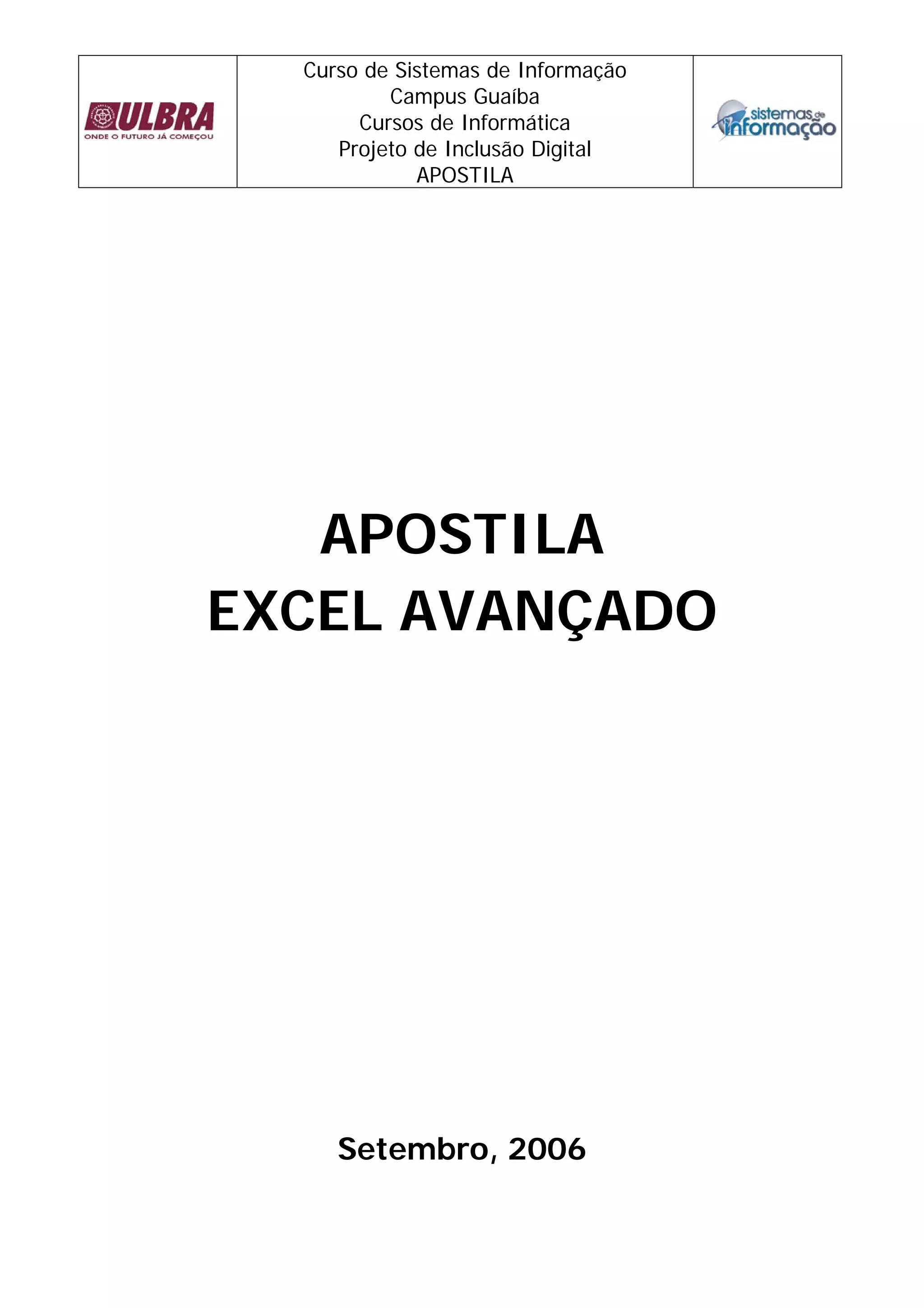 Este documento é uma apostila sobre funções avançadas do Excel. Ele ensina como formatar números, digitar datas e horas, usar fórmulas como máximo, mínimo, média, raiz, exponencial e potência. Também ensina fórmulas condicionais como SE, SE e E, SE e OU, CONTSE, SOMASE e como renomear, inserir e excluir planilhas no Excel. No final, pede para o aluno realizar dois exercícios práticos usando essas funções.