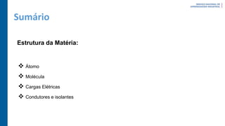1. O documento discute conceitos fundamentais de eletroeletrônica, incluindo a estrutura da matéria a nível atômico e molecular, cargas elétricas e tipos de materiais.