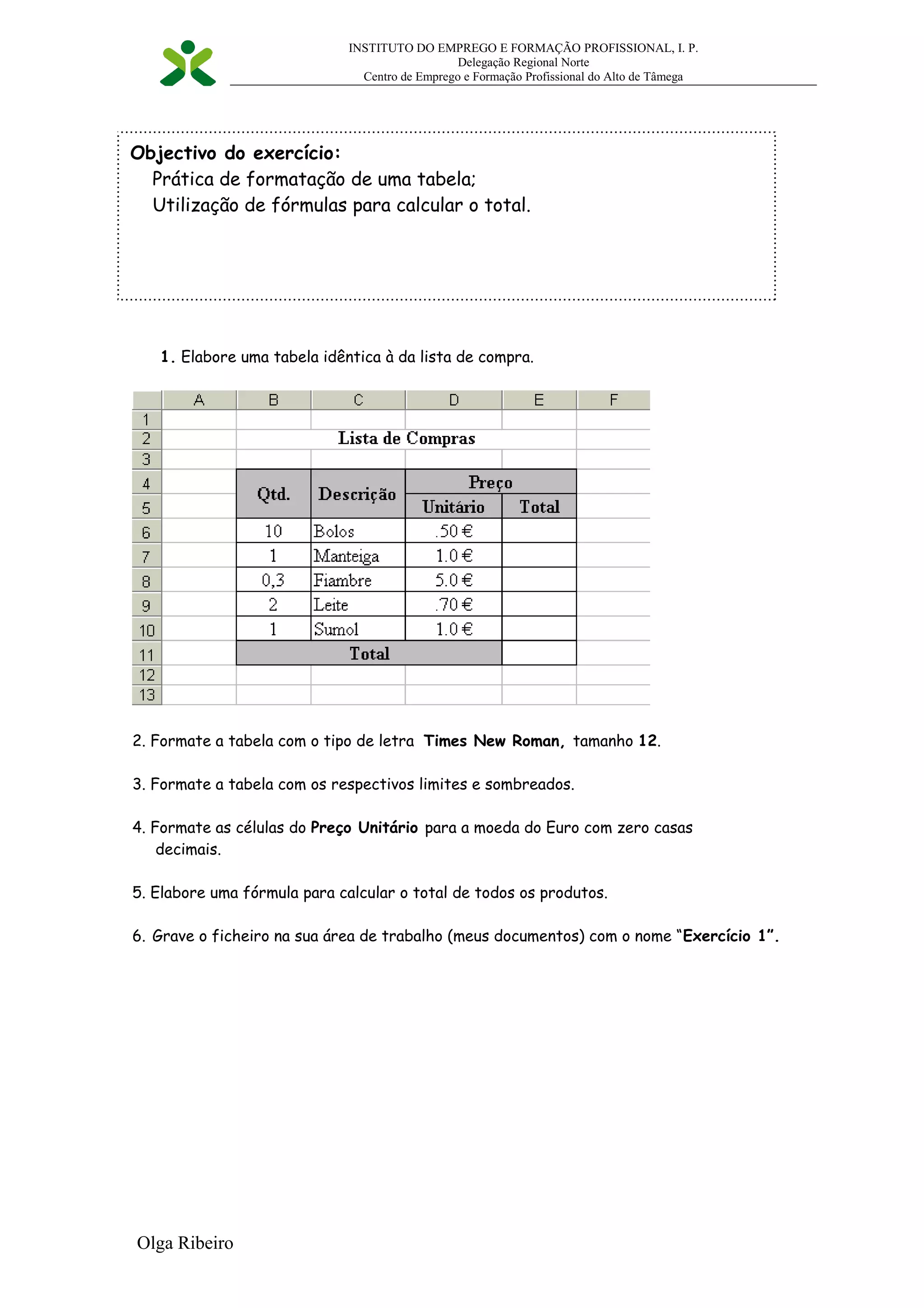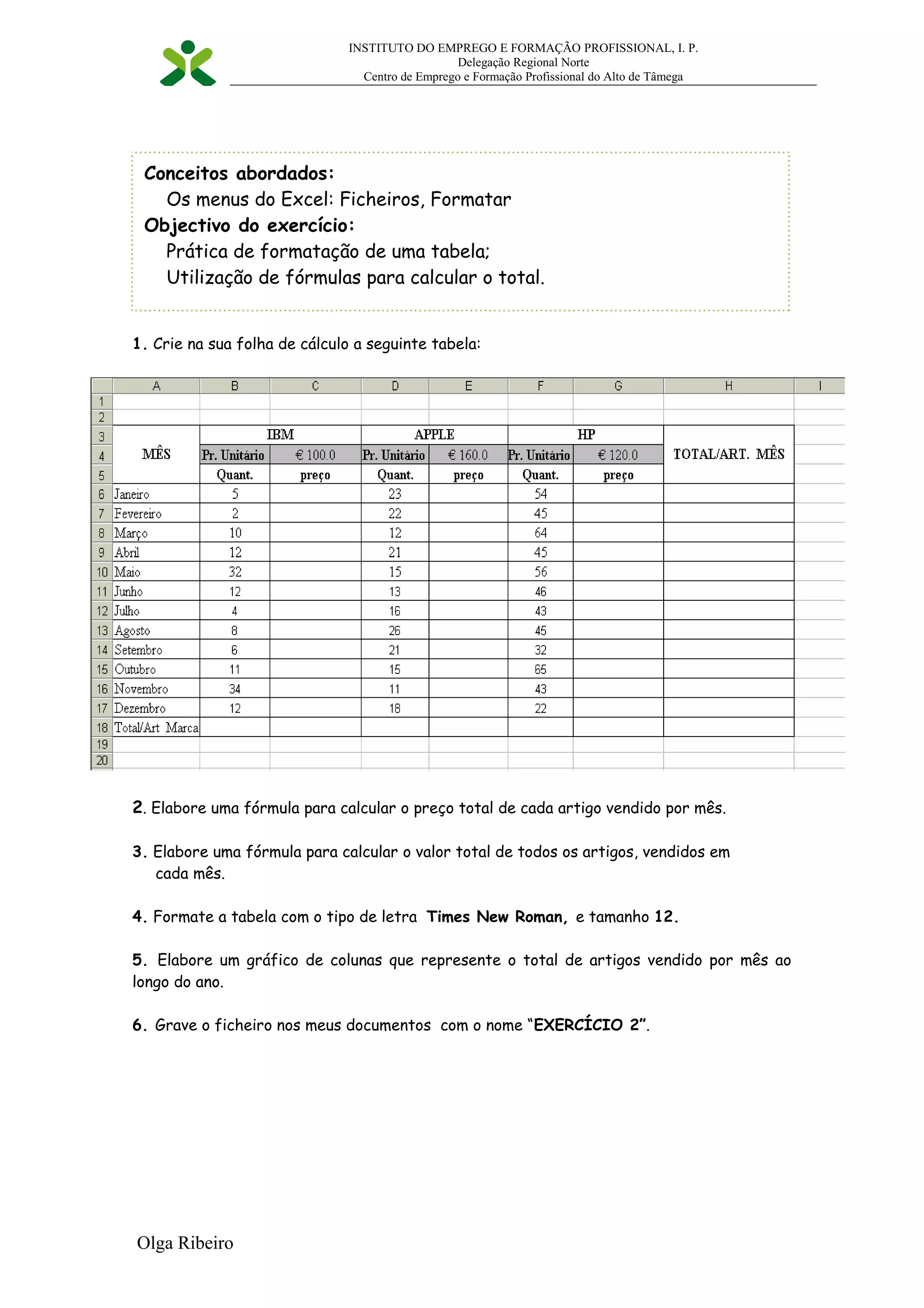 O documento fornece instruções para a realização de vários exercícios práticos no Excel, incluindo a criação de tabelas, uso de fórmulas para cálculos, formatação de células e criação de gráficos. Os exercícios visam a prática de habilidades como formatação, uso de fórmulas e criação de gráficos de colunas.