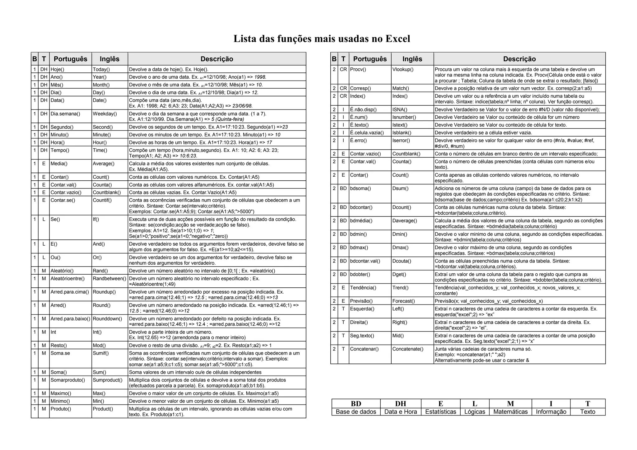 O documento lista as funções mais usadas no Excel, agrupadas por categoria. Inclui funções para trabalhar com datas e horas, estatísticas, lógica, matemática, verificação de informação e texto. As funções permitem realizar cálculos, análises e verificações em planilhas.