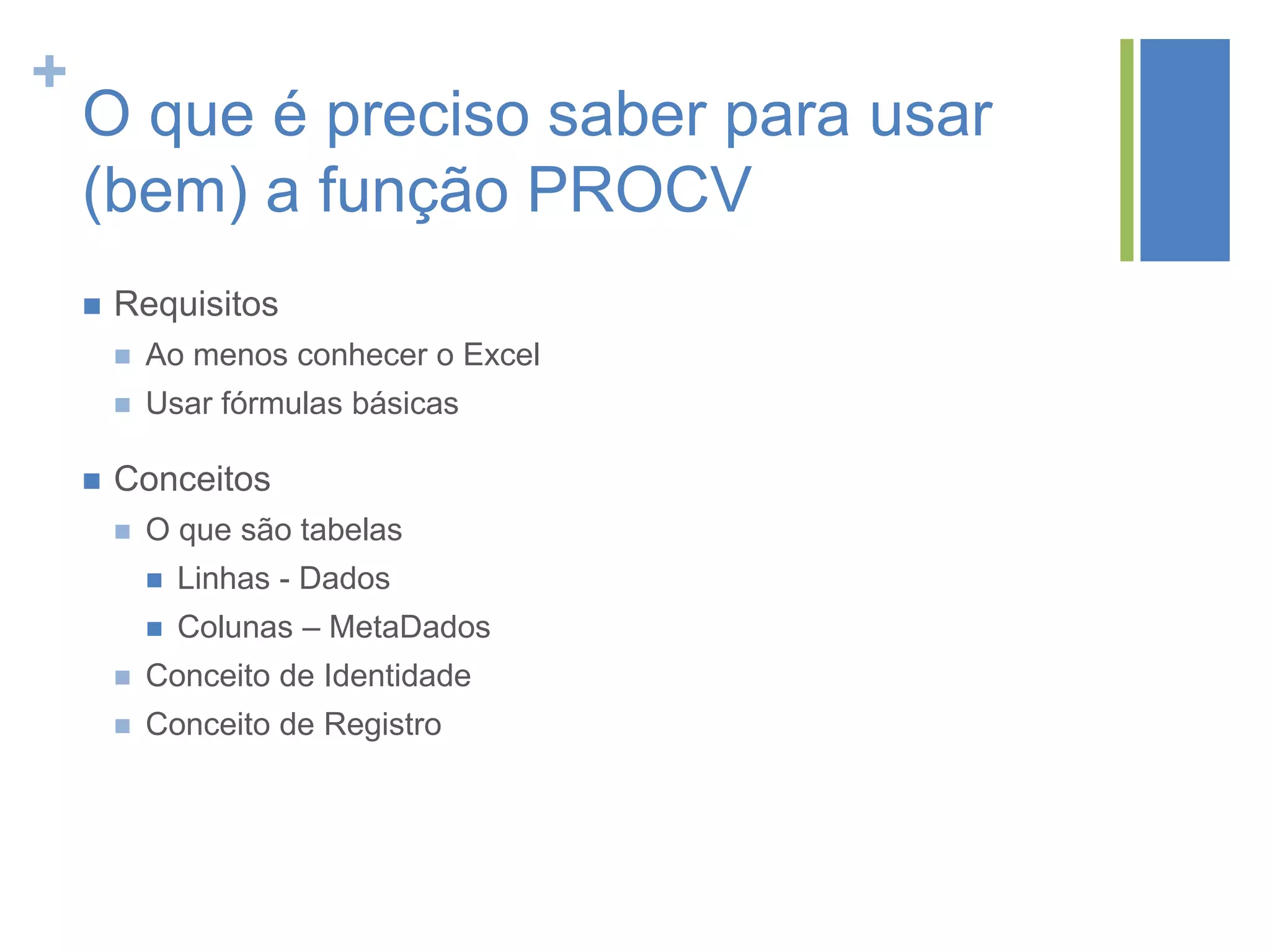 O documento explica como usar a função PROCV no Excel para buscar dados em uma tabela. Ele define o que é uma tabela e os conceitos de linha, coluna, identidade e registro. Em seguida, descreve os parâmetros da função PROCV, incluindo o valor procurado, a matriz tabela, o número da coluna e a opção de procura. Por fim, demonstra um exemplo prático da função.
