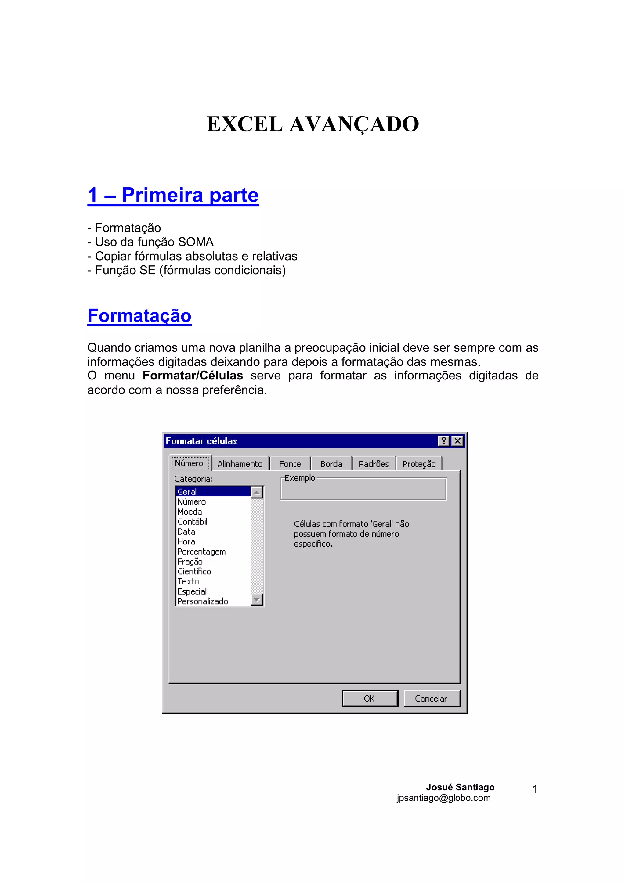 Este documento fornece instruções sobre funções avançadas do Excel, incluindo (1) formatação de células, (2) uso de funções como SOMA e SE, (3) copiar fórmulas absolutas e relativas, e (4) criar vínculos entre planilhas. O documento explica como formatar dados, criar fórmulas condicionais, e usar funções como PROCV para pesquisar dados em um banco de dados no Excel.