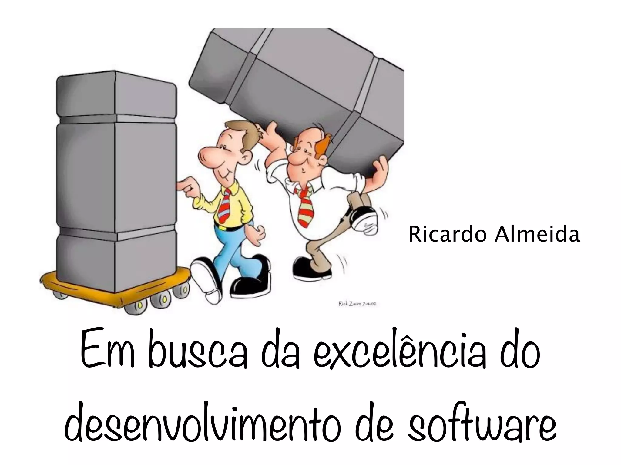 Ricardo Almeida apresenta sobre métodos ágeis de desenvolvimento de software. Ele discute princípios como entrega frequente, feedback constante, automação, cultura de aprendizado e mindset de crescimento. O documento também aborda tópicos como teste dirigido por comportamento, integração contínua, devops e estimativas ágeis.