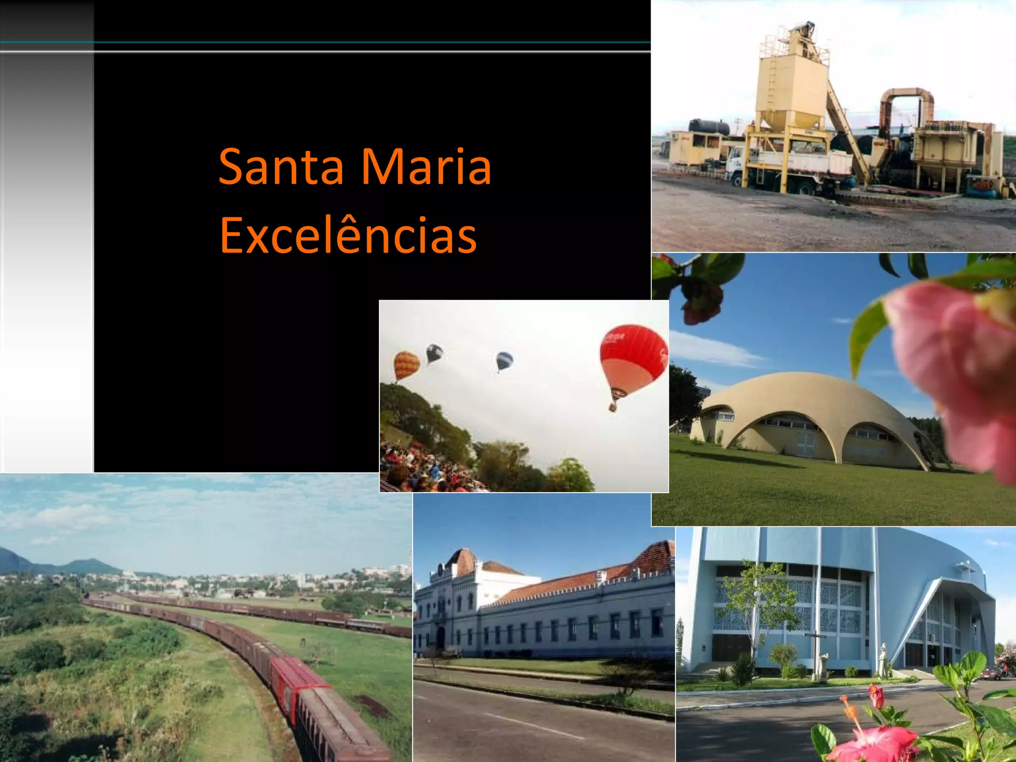 O documento apresenta as principais excelências de empresas, organizações e instituições de Santa Maria identificadas por meio de pesquisa. São destacadas grandes empresas como CVI, Rede Vivo e Frigorífico Silva, médias como Agrimec e Labimed, pequenas como Bianchini e Schuster, organizações assistenciais como Lar das Vovozinhas e AAPECAN, não assistenciais como UFSM, Hospital de Caridade e organizações como Condomínio Icárdio. As excelências incluem desempenho financeiro, inovação, cooperação
