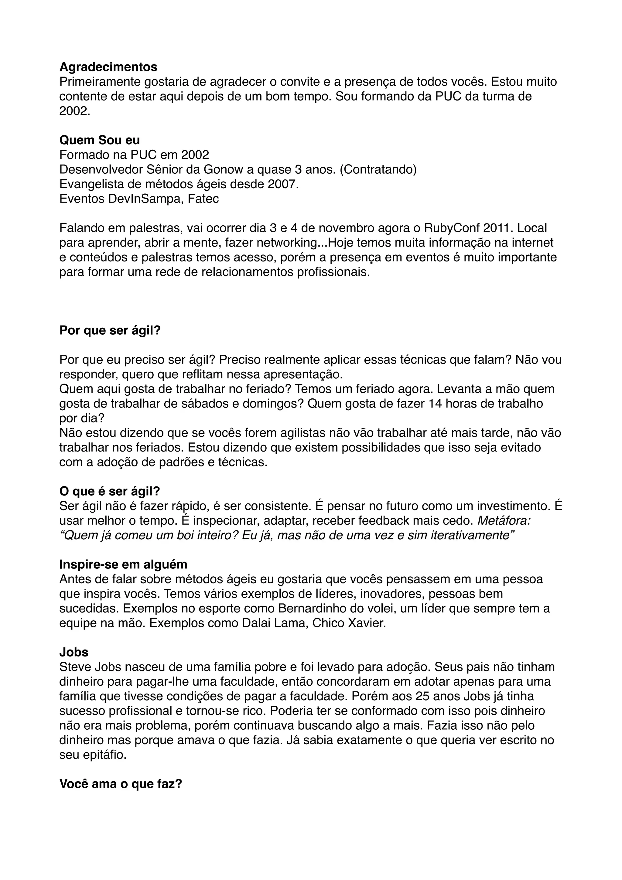 2) O palestrante fala sobre a importância de inspirar-se em líderes como Steve Jobs e sobre amar o que faz.