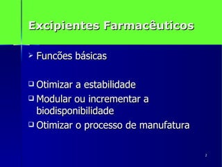 O documento discute os excipientes farmacêuticos, seus tipos e funções. Excipientes são substâncias inertes que auxiliam no processo de fabricação e liberacao do princípio ativo. Eles podem otimizar a estabilidade, modular a biodisponibilidade e otimizar o processo de manufatura. Excipientes comuns incluem diluentes, desintegrantes, tampões e revestimentos. Sua escolha depende da via de administração, propriedades físico-químicas do fármaco e objetivos terapêuticos.