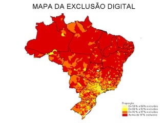 O documento apresenta dados sobre a inclusão digital no Brasil em 2001, mostrando que: 12,46% da população tinha acesso a computador e 8,31% à internet; a taxa de acesso era maior entre aqueles com mais escolaridade, idade entre 20-25 anos, e que contribuíam para a previdência. O documento também analisa os dados por estado e município.