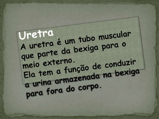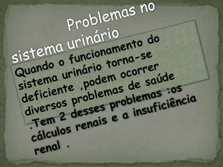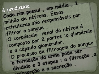 O documento discute os processos de excreção no corpo humano. Ele explica que as células produzem resíduos durante o metabolismo que precisam ser eliminados, principalmente através do sistema urinário. O sistema urinário é composto pelos rins, ureteres, bexiga e uretra, e os rins contêm estruturas chamadas néfrons que filtram o sangue e produzem a urina para remover os resíduos do corpo.