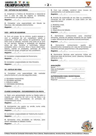 Este documento descreve os requisitos para se tornar um Excursionista no Clube de Desbravadores. Ele inclui objetivos como memorizar versículos bíblicos, ler livros, participar de atividades da igreja e comunidade, e completar especialidades em áreas como saúde, natureza e liderança.