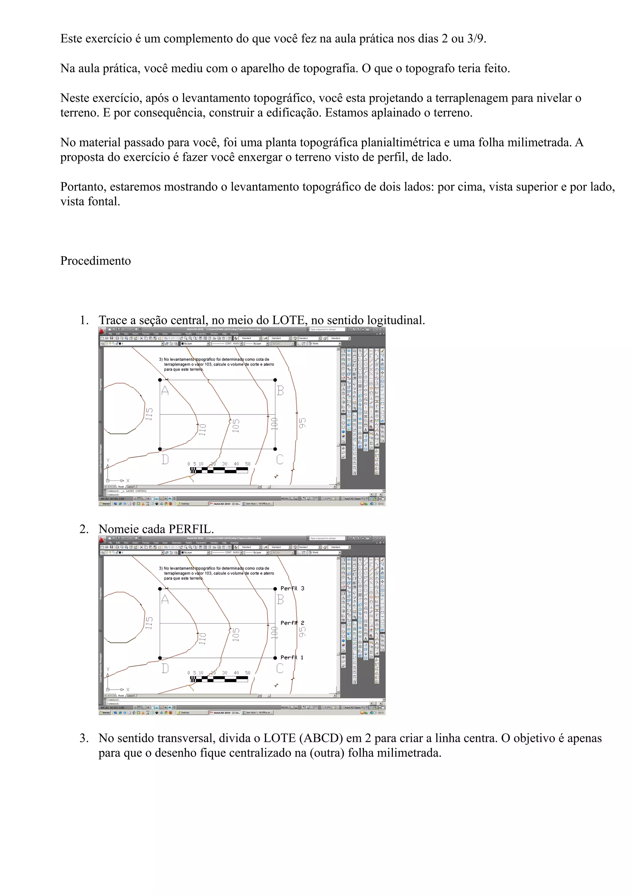 Este documento fornece instruções para projetar a terraplenagem de um terreno após um levantamento topográfico, incluindo desenhar perfis do terreno natural e com terraplenagem, calcular as áreas e volumes de corte e aterro, e considerar inclinações de taludes.