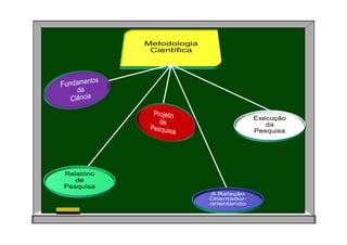 Este documento descreve o processo de pesquisa científica, incluindo planejamento, execução, divulgação e avaliação. Ele explica conceitos importantes como referencial teórico, metodologia, tipos de pesquisa, coleta e análise de dados, e interpretação. O documento fornece uma visão geral do processo completo de pesquisa científica.