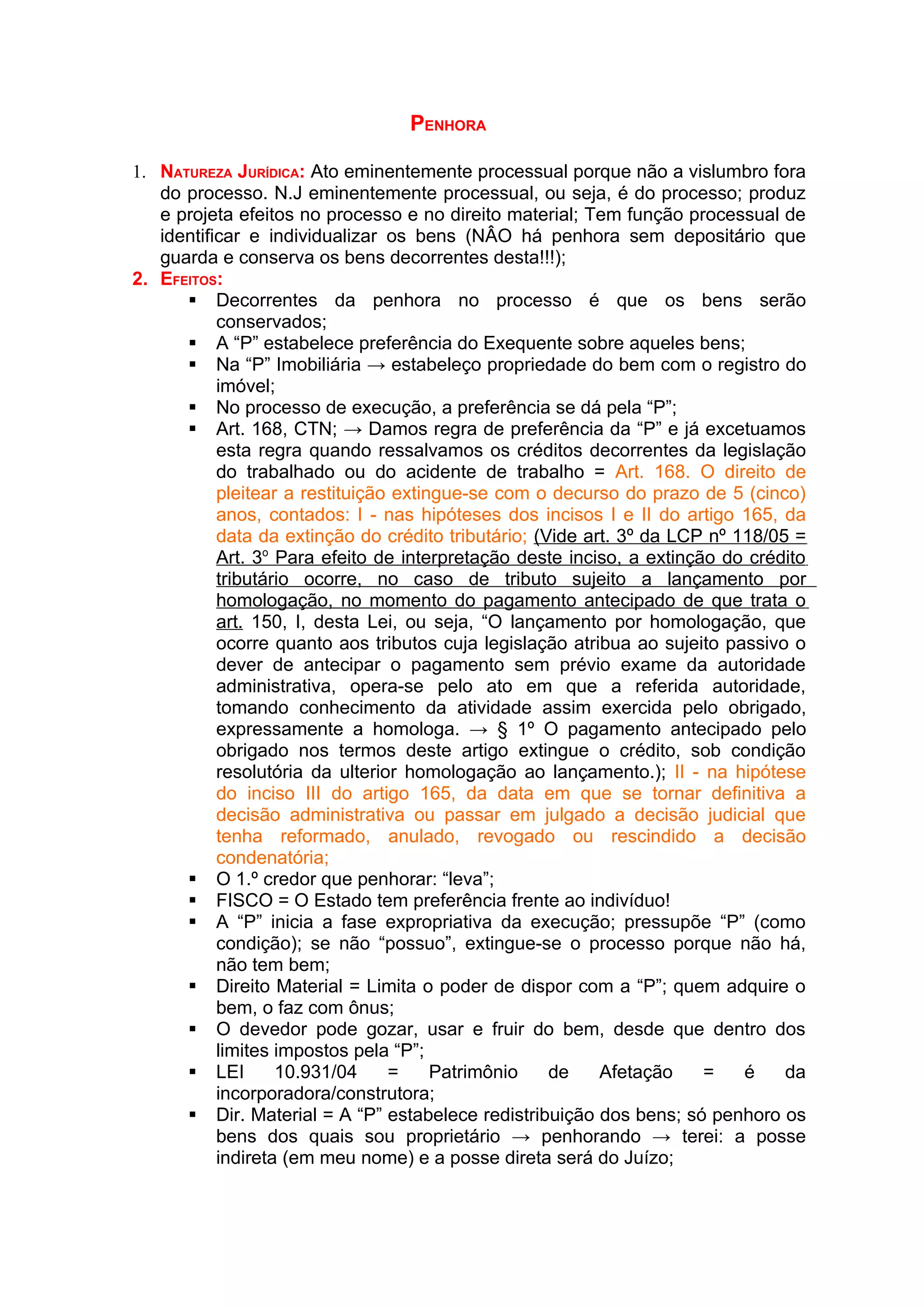 [1] A penhora é um ato processual que tem como objetivo identificar e individualizar os bens do devedor para garantir o pagamento da dívida no processo de execução. [2] A penhora estabelece preferência do credor sobre os bens penhorados e inicia a fase expropriativa da execução. [3] Há uma ordem de preferência para a penhora de diferentes tipos de bens como dinheiro, veículos, imóveis e quotas de sociedades.