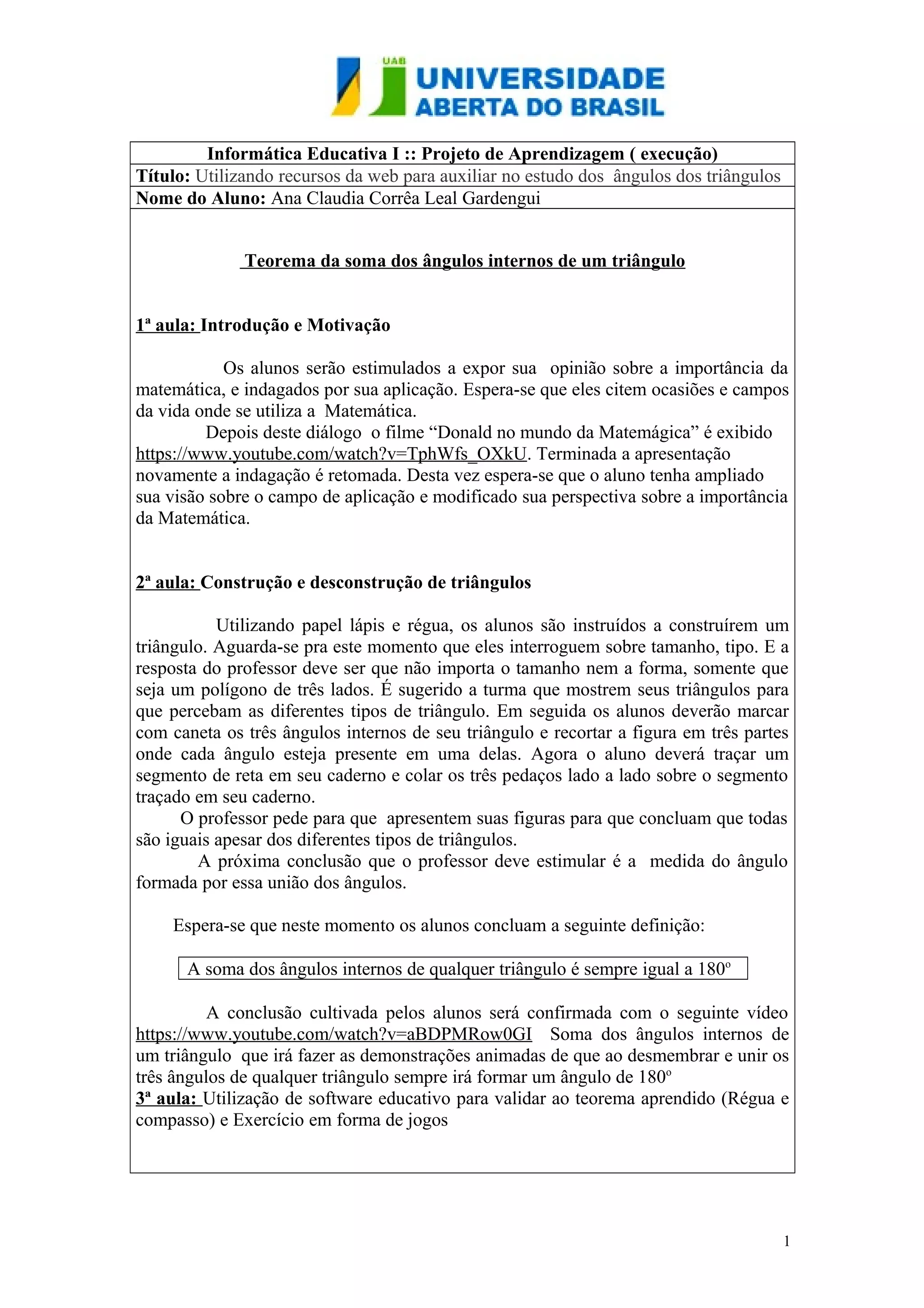 O documento descreve um projeto de ensino sobre ângulos de triângulos utilizando recursos online. Aprendizagem é conduzida através de 4 aulas: 1) introdução ao tema com vídeo motivacional, 2) construção de triângulos para descobrir a soma dos ângulos, 3) software para validar o teorema, 4) lista de exercícios para aplicar o conhecimento.
