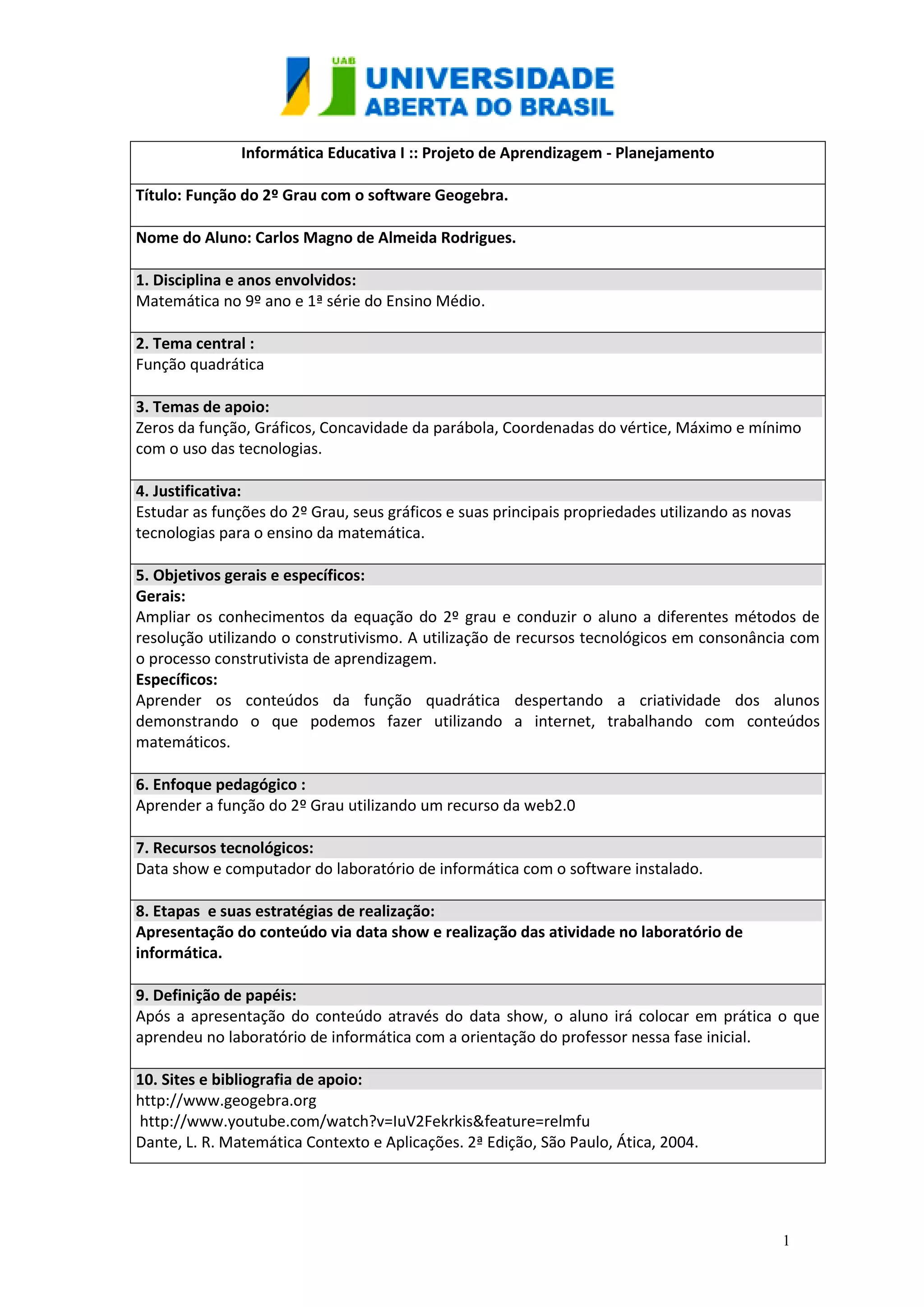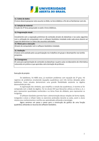 Este documento descreve um projeto de ensino sobre funções quadráticas utilizando o software Geogebra. O projeto abrange alunos do 9o ano e 1a série do ensino médio e tem como objetivo ampliar os conhecimentos sobre equações de 2o grau e seus gráficos de forma interativa com tecnologia.