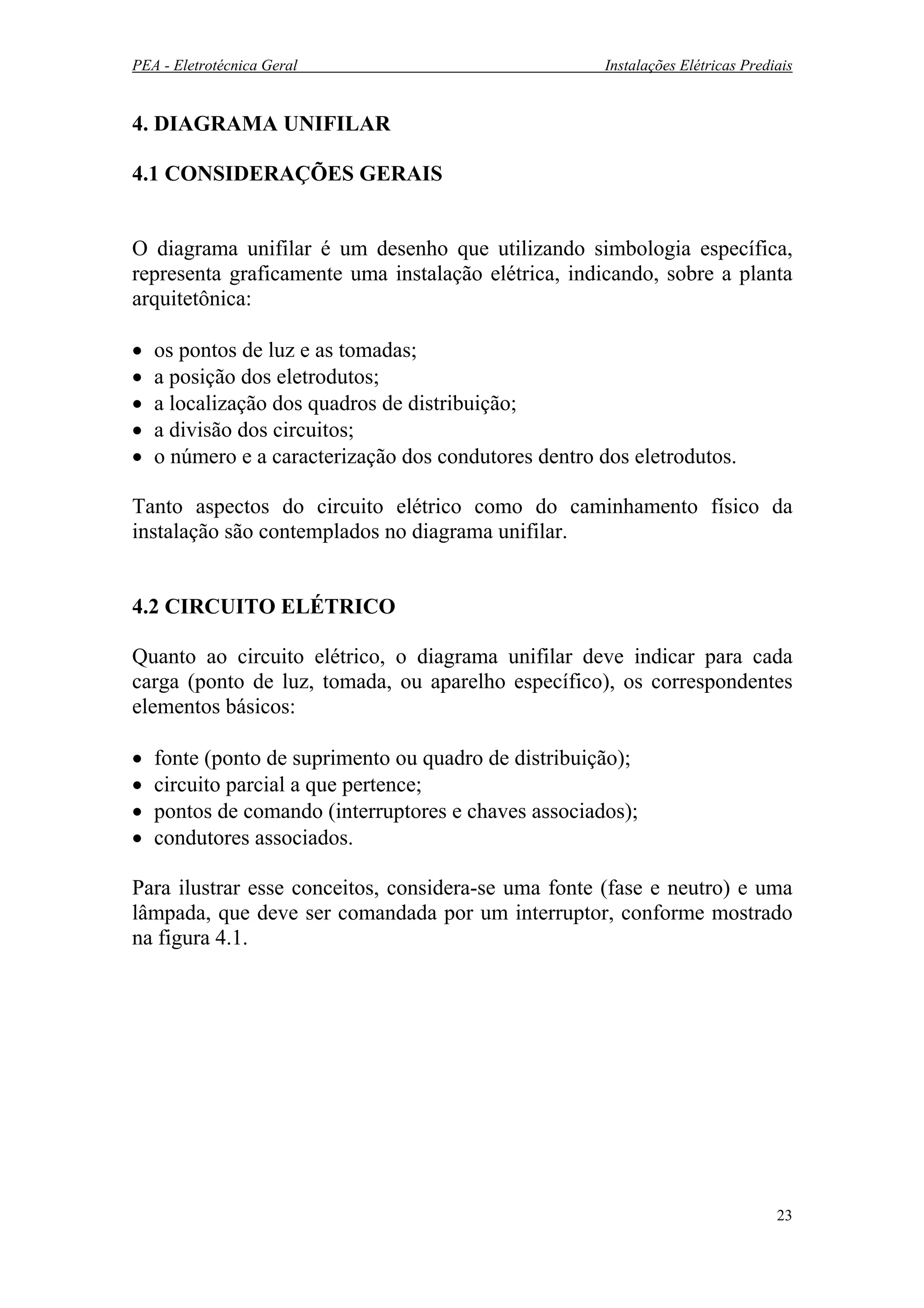 O documento descreve os conceitos e componentes básicos de um diagrama unifilar, incluindo a representação gráfica de circuitos elétricos, elementos e simbologia. É explicado como um diagrama unifilar representa a instalação elétrica de um prédio sobre a planta arquitetônica, indicando pontos de luz, tomadas, eletrodutos, quadros de distribuição e circuitos. São detalhados os tipos de comando para pontos de luz e como eles são representados no diagrama.