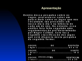 O documento apresenta 10 jogos tradicionais brasileiros classificados na categoria de jogos de disputa segundo Roger Caillois. Cada jogo é descrito com suas regras, objetivos, equipamentos e como é jogado. Os jogos incluem corrida do ovo, cinco cortes, cabo de guerra, túnel da bola e outros.