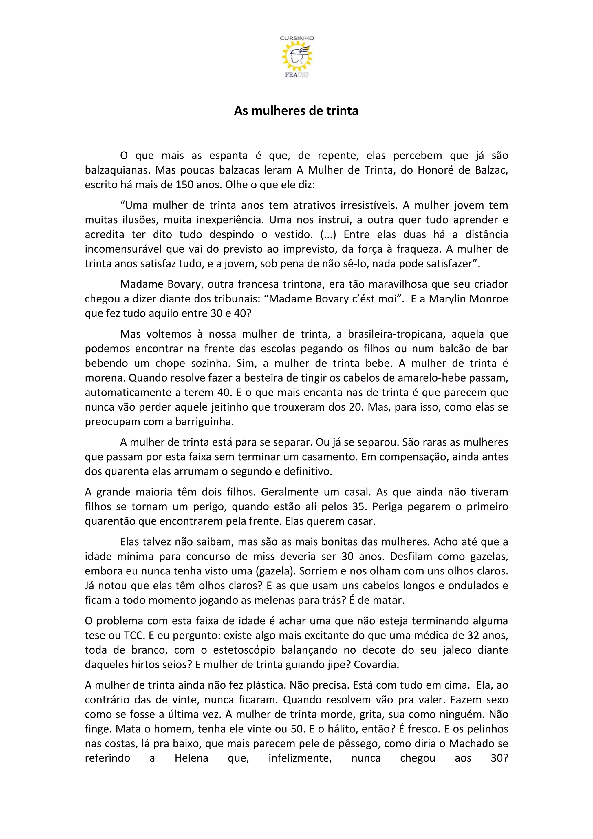 O documento descreve as qualidades e características das mulheres com trinta anos de idade de acordo com o escritor Honoré de Balzac e a perspectiva do autor. Ele destaca que as mulheres de trinta anos são maduras, experientes e sabem o que querem, além de serem independentes e sexualmente atraentes.