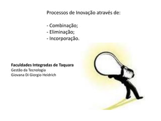 Este documento descreve três processos de inovação: combinação, eliminação e incorporação.