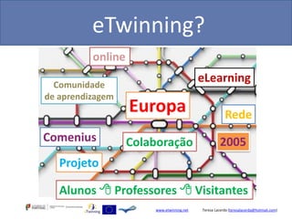 O documento fornece exemplos de projetos realizados através do programa eTwinning e discute como ele pode preparar os alunos para o futuro. O eTwinning permite que escolas desenvolvam projetos colaborativos com escolas europeias em diferentes áreas, como artes, línguas e tecnologia. Exemplos incluem projetos entre jardins de infância, escolas primárias e secundárias sobre artistas e história europeia.