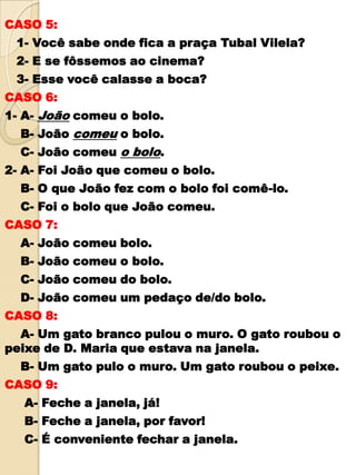 CASO 5: 1- Você sabe onde fica a praça Tubal Vilela? 2- E se fôssemos ao cinema? 3- Esse você calasse a boca?CASO 6:1- A- Joãocomeu o bolo. B- João comeu o bolo. C- João comeu o bolo.2- A- Foi João que comeu o bolo. B- O que João fez com o bolo foi comê-lo. C- Foi o bolo que João comeu.CASO 7: A- João comeu bolo. B- João comeu o bolo. C- João comeu do bolo. D- João comeu um pedaço de/do bolo.CASO 8:A- Um gato branco pulou o muro. O gato roubou o peixe de D. Maria que estava na janela.B- Um gato pulo o muro. Um gato roubou o peixe.CASO 9: A- Feche a janela, já! B- Feche a janela, por favor! C- É conveniente fechar a janela.
